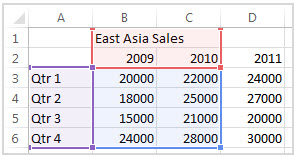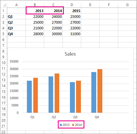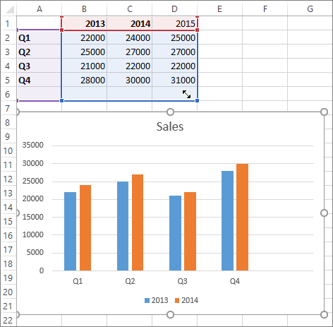 In this example, we have a chart that shows 2013 and 2014 quarterly sales data, and we've just added a new data series to the worksheet for 2015. Note that the chart does not yet display the 2015 data series.
