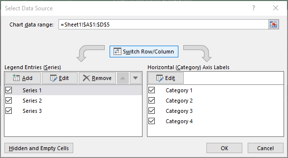 The Select Data Source dialog box appears on the worksheet that contains the source data for the chart.