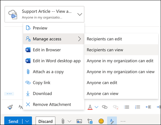 5. By default, if you're in a business environment, everyone within your organization can edit the linked file. To change these permissions, select the arrow at the right of the attachment name to display a drop-down menu with a variety of permission options.new Outlook attachment permissions window