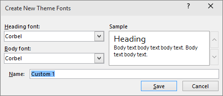 3. In the Name box, type an appropriate name for the new theme fonts, and then select Save.
