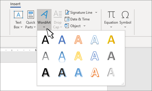 Note:Â The WordArt icon is located in the Text group, and it may appear different depending on the version you're using and the size of your screen. The icon may also look like this