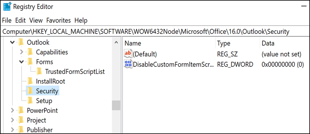 HKEY_LOCAL_MACHINE\SOFTWARE\WOW6432Node\Microsoft\Office\16.0\Outlook\Forms\TrustedFormScriptList