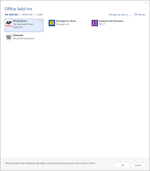 2. In the Office Add-ins box, select My Add-ins to view your add-ins. Or browse for the add-in you want by selecting Store tab and using the Search box.