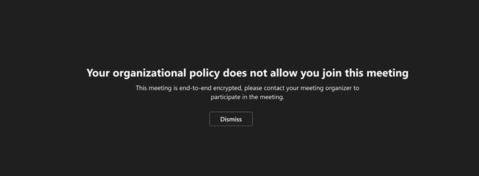 Security policies for the meeting are preventing you from joining:Â If a meeting organizer enables end-to-end encryption for a meeting, you might have limited access to join. Try reaching out to the organizer to be let in.