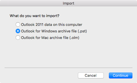 4. Select Outlook for Windows archive file (.pst) > Continue.