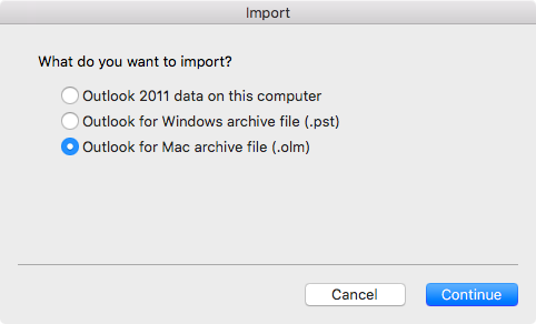 3. In the Import box, select Outlook for Mac archive file (.olm) > Continue.