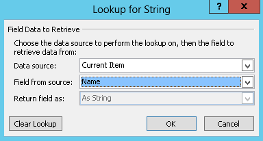 In the Lookupfor String dialog, in the Data Source field, select Current Item, and in the Field from source field, select Name.