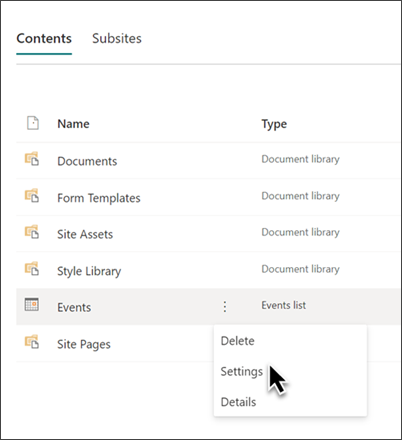 2. Hover over Events, select the ellipses (...) and then Settings.