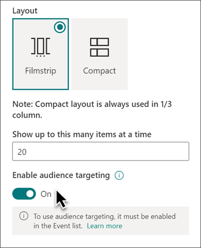 By using audience targeting, you can highlight content to specific groups of people. This is useful when you want to present information that is most relevant to a particular group of people. For example, you can target events to team members and stakeholders that would be most interested.