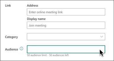 5. In the Link section, you can enter an online meeting link if you have one. Put the link in the Address box, and then add a Display name. If you don't have an online meeting and enter nothing, this section will not appear in the event.