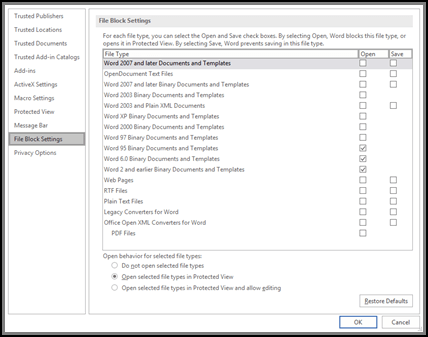 • Do not open selected file types     The file types selected with check marks are blocked from opening, or opening and saving. You will see an error message when this is set.