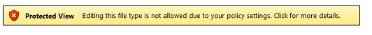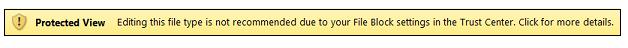 • Open selected file types in Protected View     Selected file types open in Protected View. The Enable Editing button is disabled on the Message Bar and in the Backstage view.