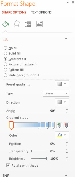 To keep the direction of the gradient fill the same as the shape when you rotate it, check the Rotate with shape check box.