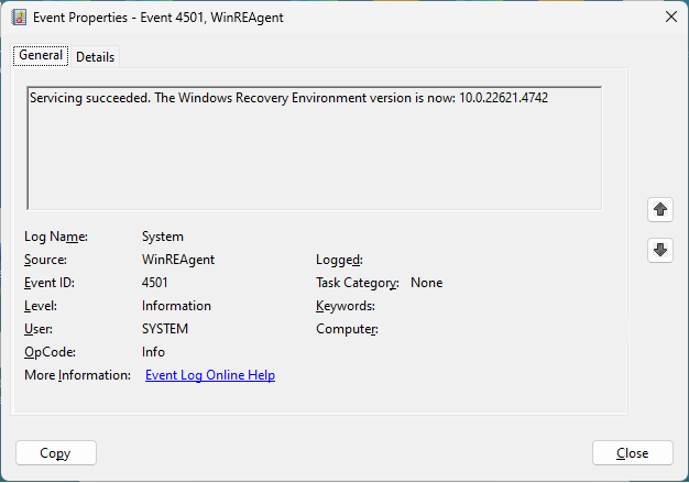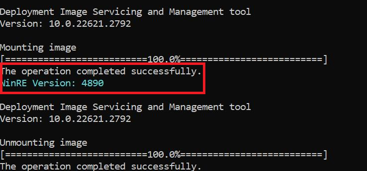 Servicing succeeded. The Windows Recovery Environment version is now: 10.0.22621.4742