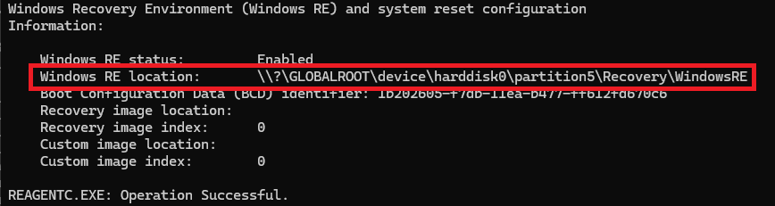 Note the path of the Windows RE location. For this example, the location is \\?\GLOBALROOT\device\harddisk0\partition5\Recovery\WindowsRE. This path may vary based on your Windows installation.